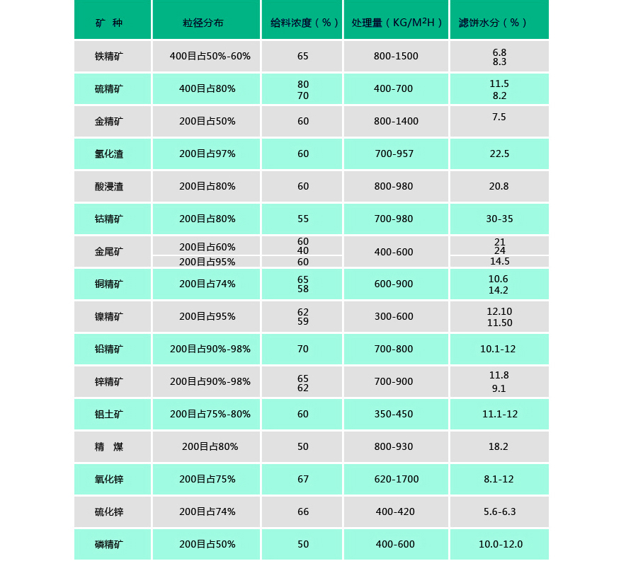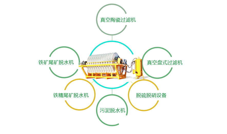 陶瓷過濾機、盤式過濾機目前已廣泛應用于銅、鐵、金、銀、錫、鋁、鉛、鋅、鎳、鈷、鈀、鉬、鉻、銘、 硫、磷、煤、硅、石英、云母、錫土等精礦、尾礦脫水、化工行業氧化鋅、氧化鉛、硫化鋅、電解渣、浸出渣、爐渣 的脫水及環保污水泥脫水廢酸處理等。物料細度從-100目到-450目以及各種超細物料。